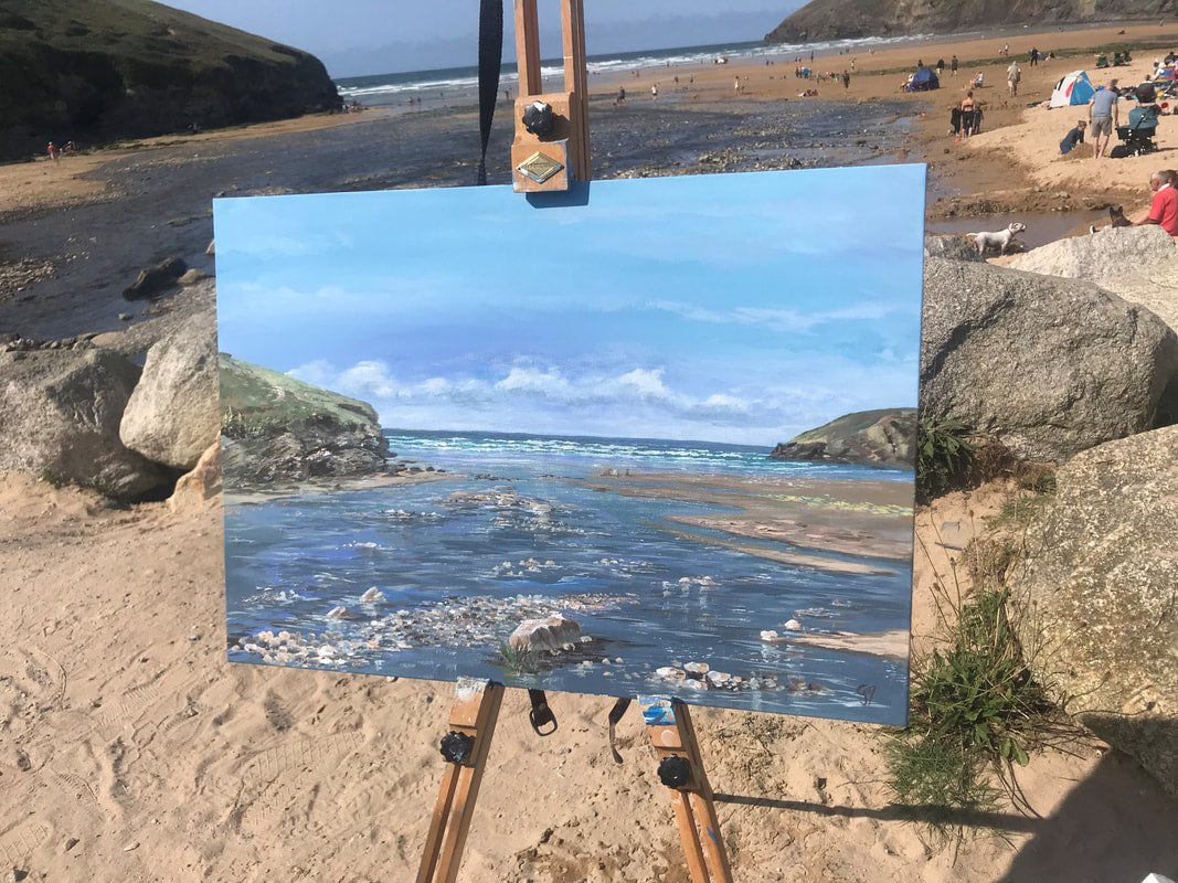 This serene coastal artwork captures Mawgan Porth Headland as it curves gently into the Atlantic, a place Jeanni knows and paints often, filled with colour, memory and rhythm. From golden sands to turquoise shallows and deep ocean blue, this is Cornwall at its most peaceful.